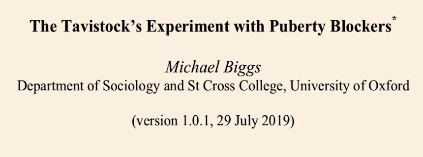 Biggs, M. (2019, July 29). The Tavistock’s Experiment with Puberty Blockers. Department of Sociology and St Cross College, University of Oxford. Retrieved from http://users.ox.ac.uk/~sfos0060/Biggs_ExperimentPubertyBlockers.pdf