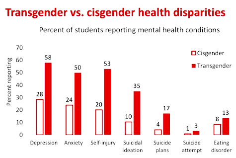 A new study called “Gender Minority Mental Health in the U.S.: Results of a National Survey on College Campuses” reviews data that shows much higher rates of mental health problems in college students with gender dysphoria.