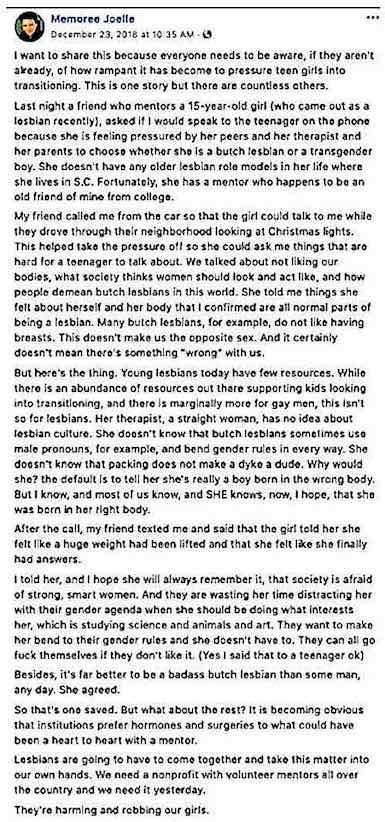 Doctors are not even considering the possibility that gender nonconforming females could live as lesbians. This screen cap is a comment circulated on Twitter, from a parent of a young person, who would have met DSM-V criteria for medical transition at a gender clinic: